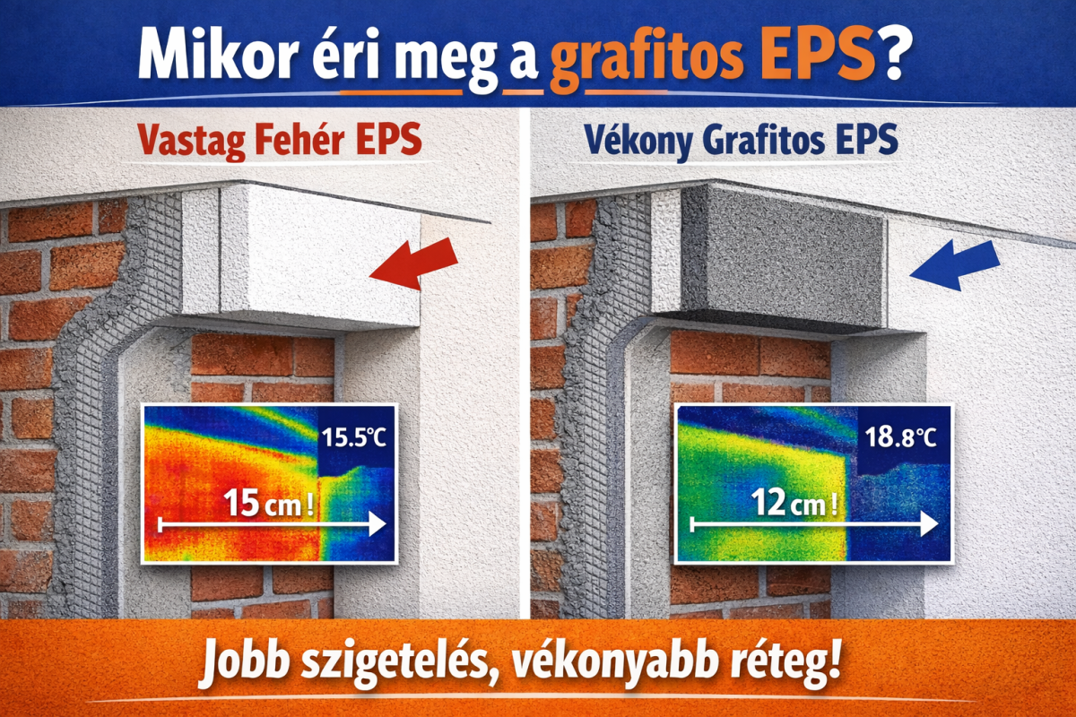 Ilyenkor a grafitos EPS nem azért éri meg, mert „szürke”, hanem mert ugyanakkora helyigényből jobb U-értéket tud hozni. Kevesebb kompromisszum lesz a bádogos és a kőműves munkáknál, kevesebb utólagos barkácsolás az ablak körül.