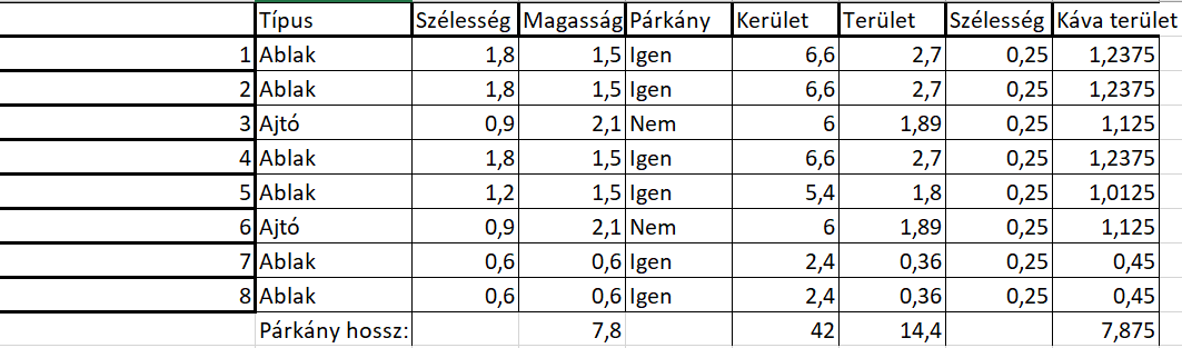 A párkány mennyiség kijön az ablakok szélességének összegéből, ami jelen esetben 7,8fm
